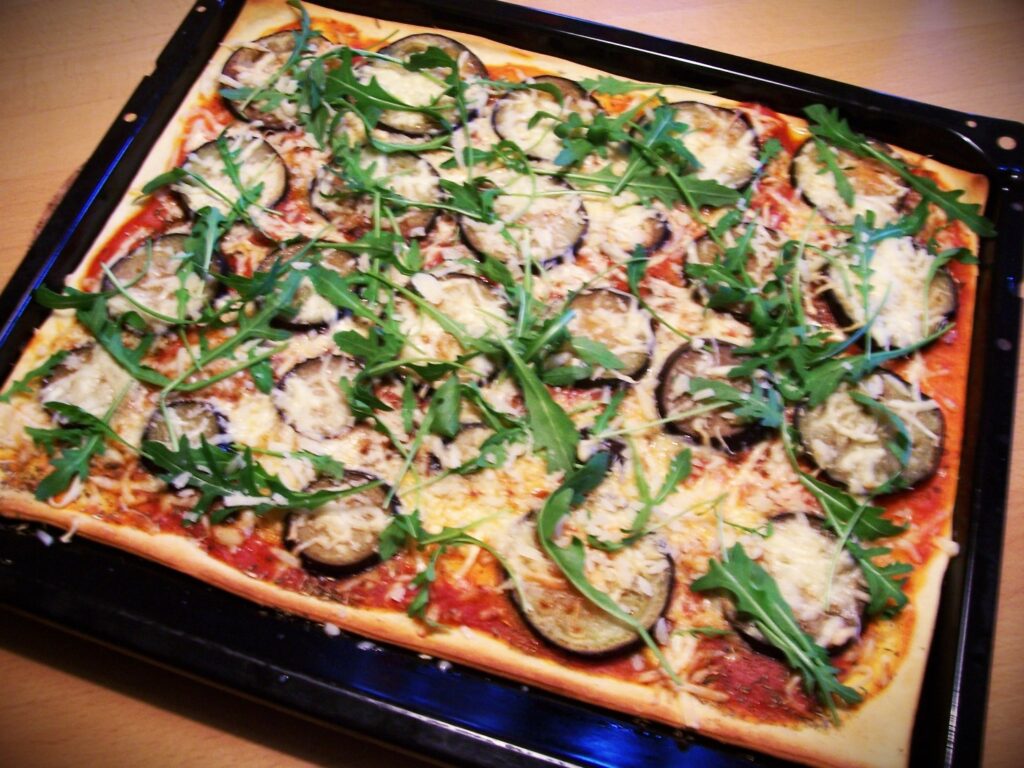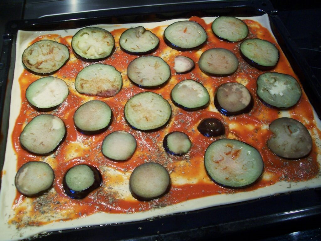 Den Teig von 1 Pizzakit (bestehend aus Hefeteig + 1 Glas Tomatensoße) auf ein gefettetes Backblech legen, 15 Min. ruhen lassen, dann auf die Größe des Backblechs ausziehen (Hefeteig selfmade geht natürlich auch).