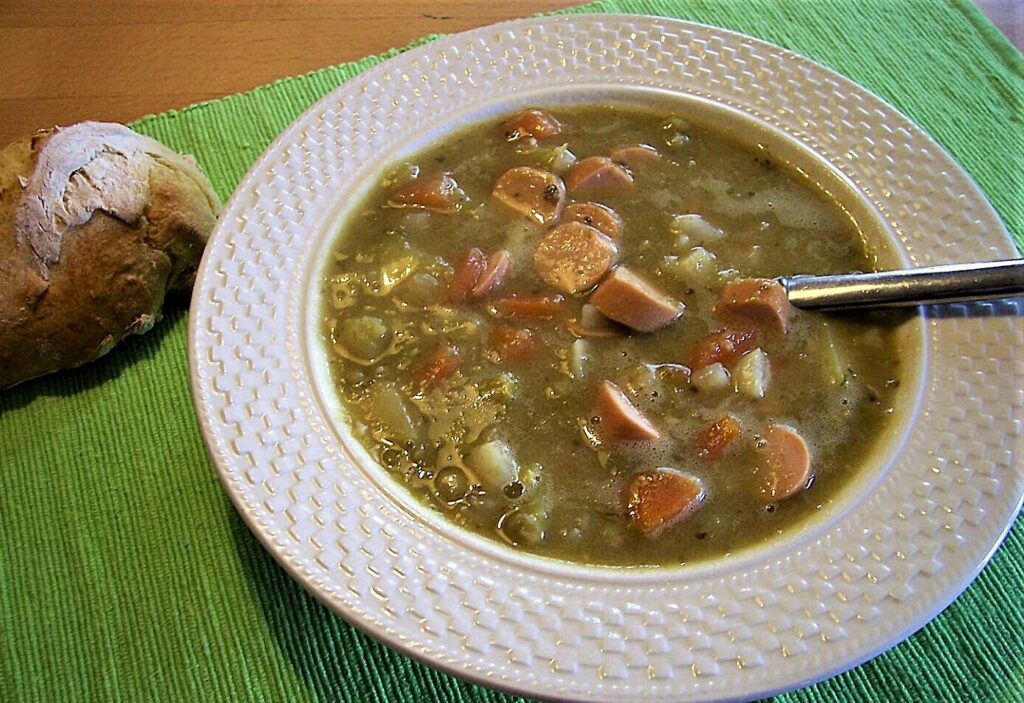 Tip: Ich bin ja sonst nicht so der Abschmecker – hier ist es aber wichtig zu prüfen, ob noch mit Rauchsalz nachgewürzt werden muss, denn dieses ergibt mit das entscheidende Erbsensuppenaroma. Rauchsalz erhältst du im gut sortierten Supermarkt. Auch ist es wichtig, geschälte Erbsen zu verwenden (habe mal ungeschälte genommen, die ihr Aroma dann offenbar kaum abgegeben haben).