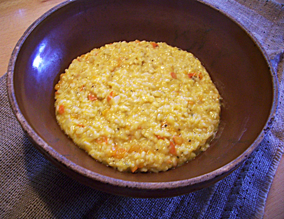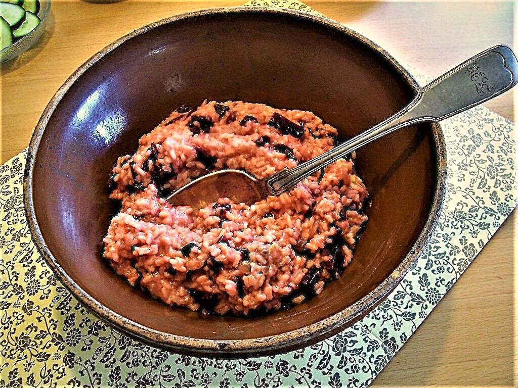 750 ml heiße Bio-Gemüsebrühe (750 ml Wasser + 3 TL Gemüsebrühpulver) zubereiten und diese nach und nach in 4 Portionen zugeben. Jede Portion im offenen Topf fast ganz verkochen lassen, dann die nächste Portion zugeben. Zwischendurch öfter umrühren.
