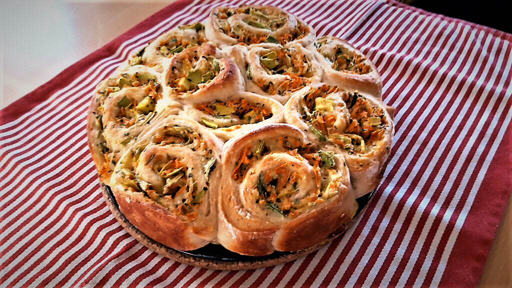 mischen, auf dem Quarkteig verteilen, von der Längsseite her aufrollen und in 10 Scheiben schneiden. Die Scheiben dicht an dicht in eine gefettete 24 cm-Springform legen (3 innen, 7 außen).