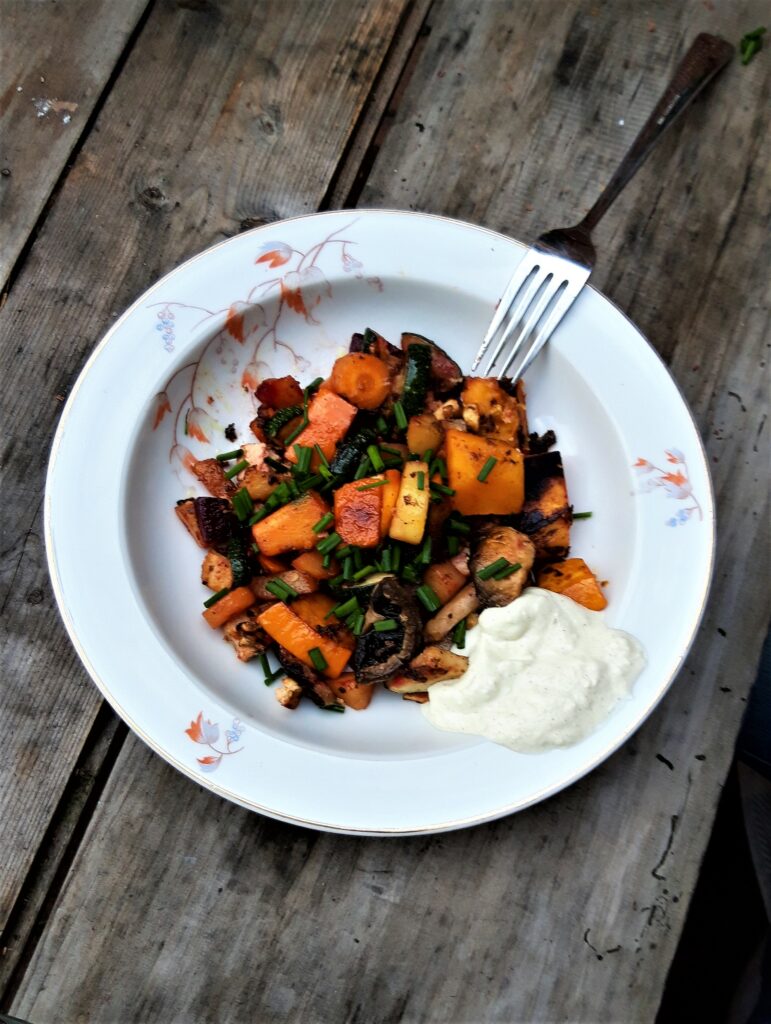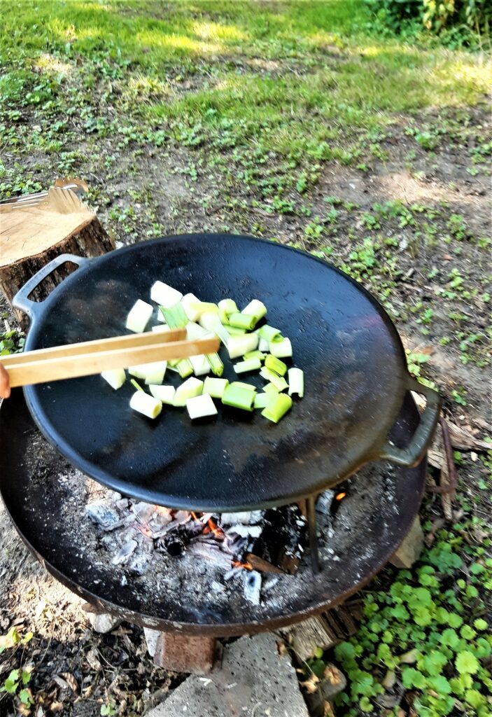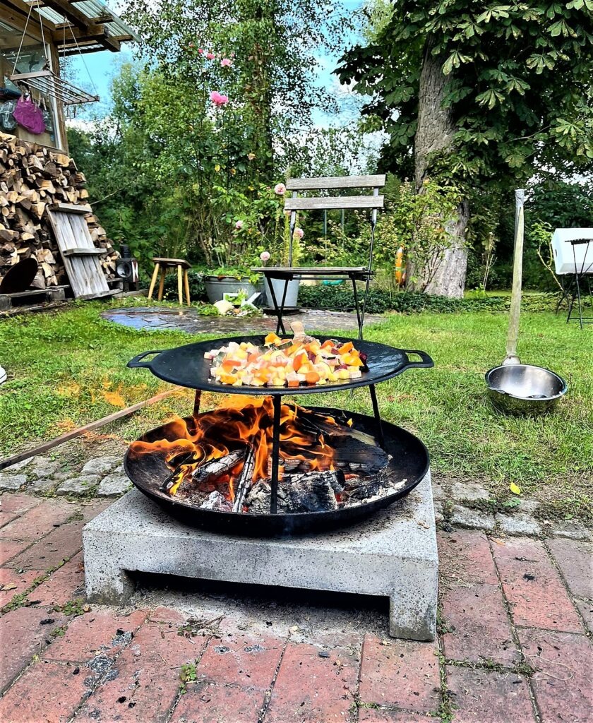 Für Vegetarier:innen und Veganer:innen optimal ist auch das Garen in einer skandinavischen Grillpfanne – Muurikka genannt. Die Muurikka wird auf 3 Beinen in eine Feuerschale gestellt, auf der zuvor ein Feuer entfacht wurde. Sie erinnert von der Form her an einen Wok, ist aber flacher gestaltet und super zum Braten von jeder Sorte Gemüse (auch Spargel – lecker!), auch mit verschiedenen Garzeiten, geeignet. Gemüse mit längerer Garzeit wie Kartoffeln, Kohlrabi, Möhre, Rosenkohl (Röschen halbiert) kommen zuerst auf die Muurikka; Kürbis, Süßkartoffel oder Pilze folgen später.