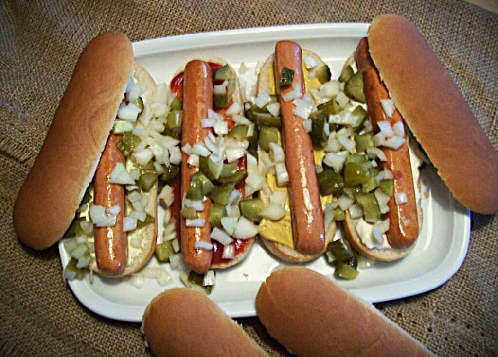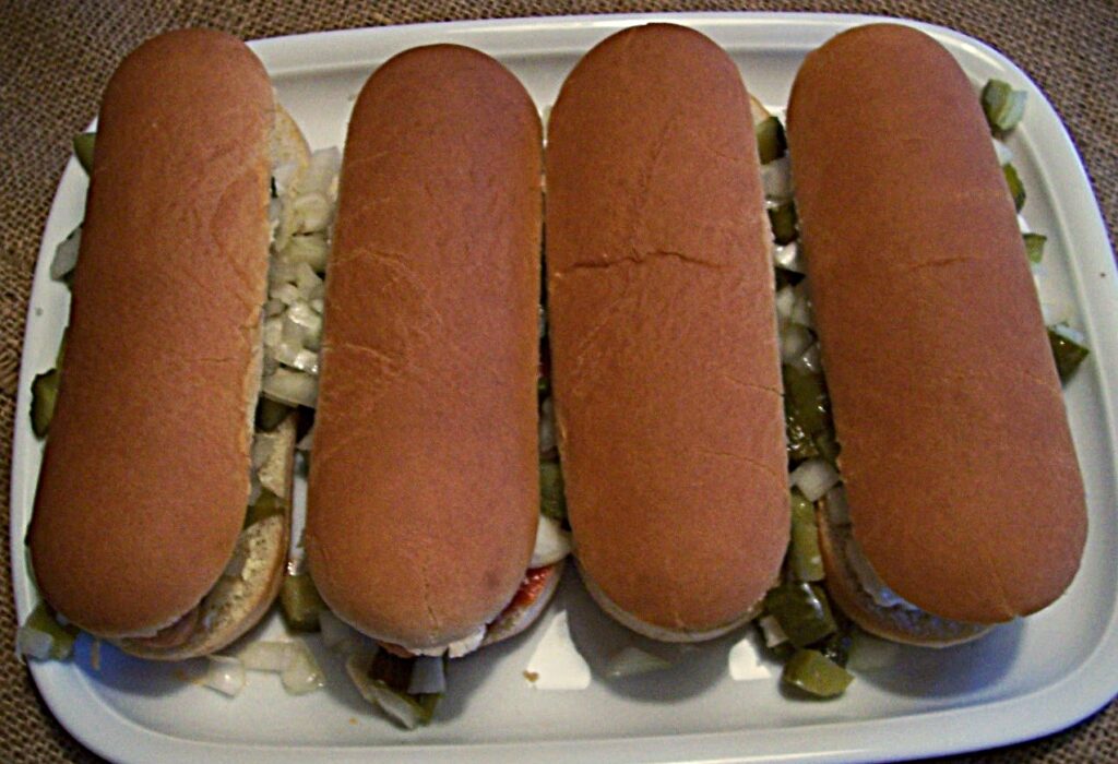 Je 1 Würstchen in ein Hotdog-Brötchen legen und die Gurken-Zwiebel-Mischung darauf verteilen.