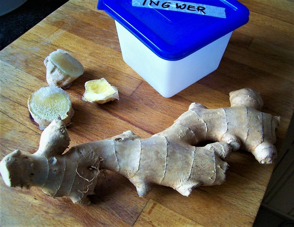 Damit ich stets frischen Ingwer zur Hand habe, schneide ich ihn in Stücke und friere ihn ein. Vor der Verwendung lasse ich ihn 10 bis 15 Minuten auftauen; so halb gefroren ist der beste Zeitpunkt, ihn fein zu reiben oder klein zu würfeln. Wenn er erst einmal ganz aufgetaut ist, dann ist er dazu zu weich.