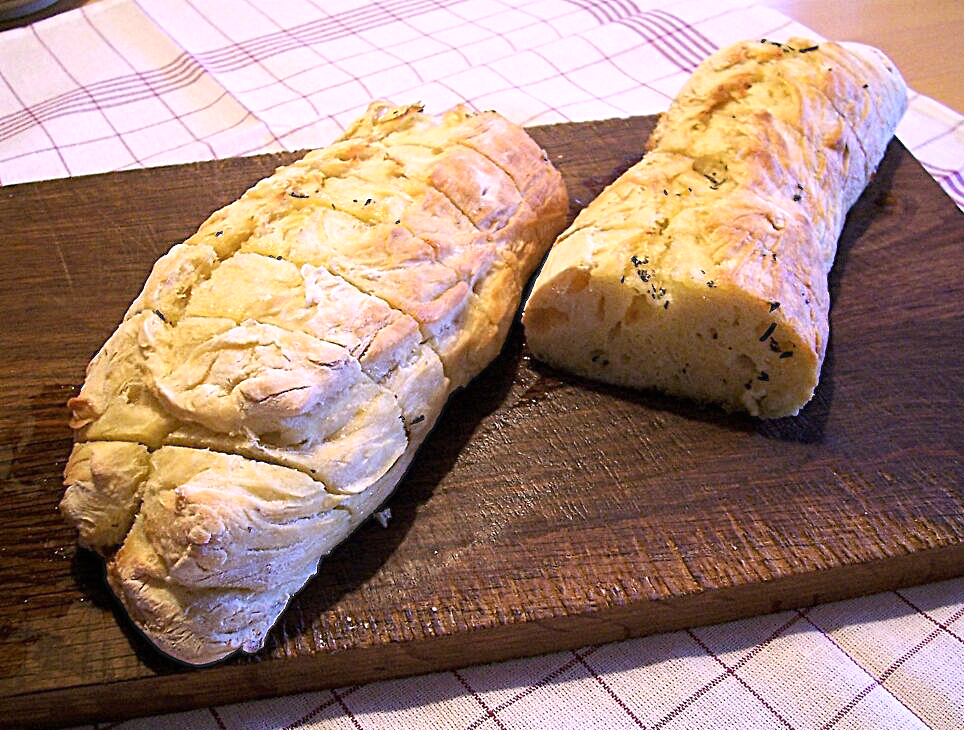 1 Ciabatta zum Aufbacken (300 g; oder 1 selbst gebackenes) derart in Scheiben schneiden, dass diese noch am Boden zusammenhängen.