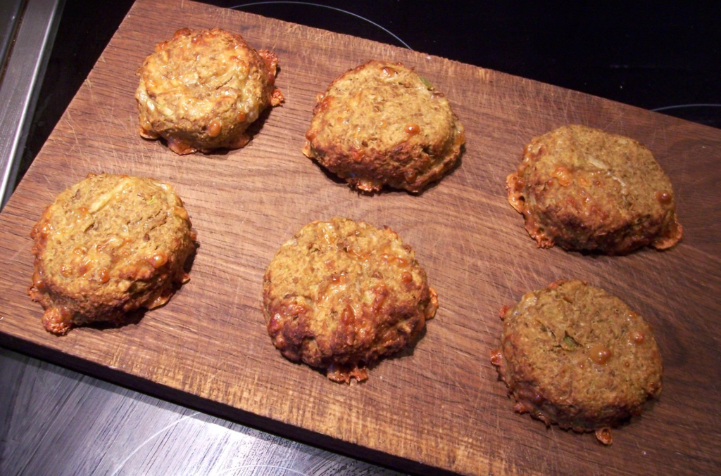 12 Bratlinge formen (falls du hast ist ein Sicheleisportionierer dafür sehr praktisch), auf ein mit Backpapier ausgelegtes Backblech setzen und etwas flach drücken.