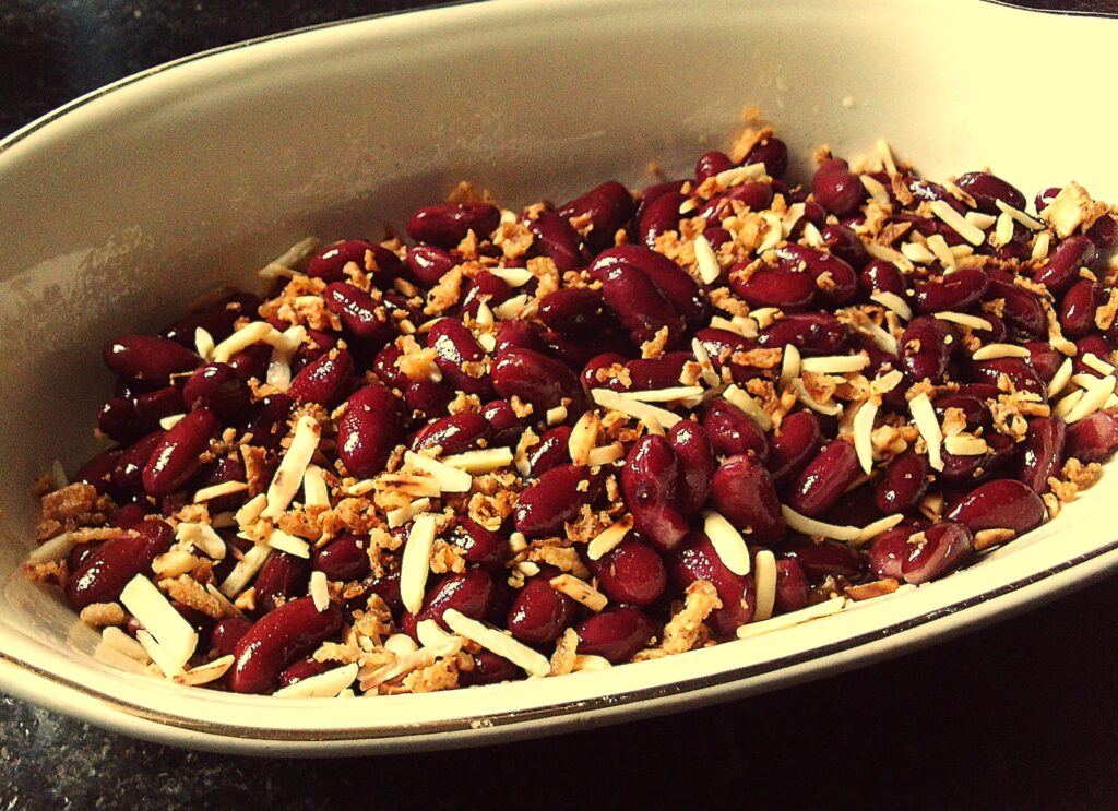 20 g Röstzwiebeln mischen, erst direkt vor dem Servieren unter die Bohnen mischen.