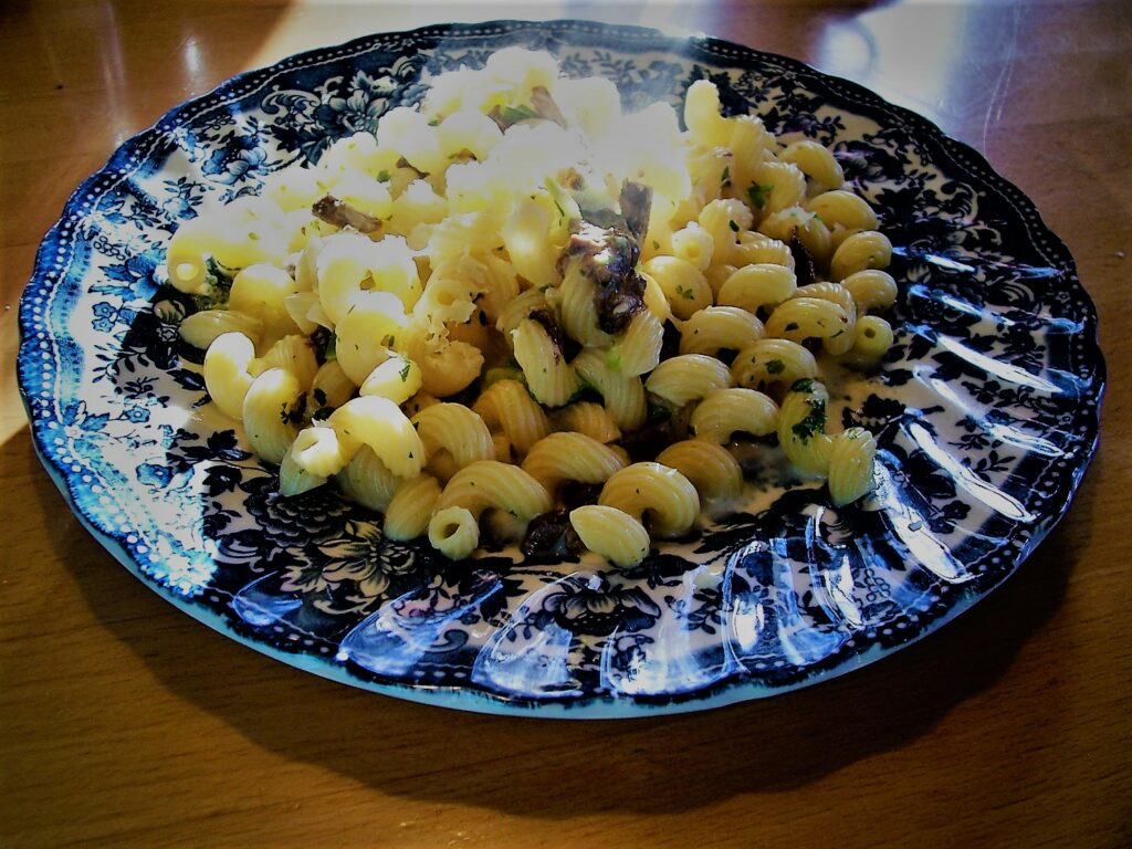 250 g Korkenziehernudeln kochen und abtropfen (es werden nachher 2 Suppenkellen Kochwasser für die Soße benötigt)