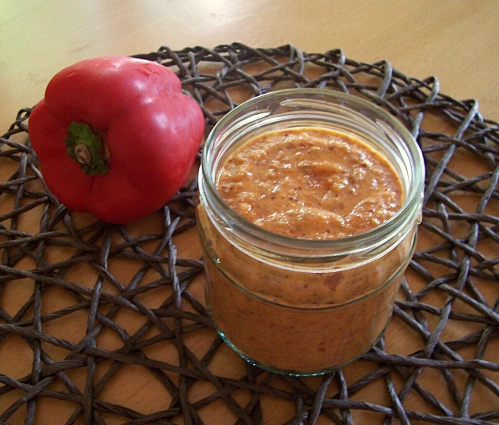 Die Tomaten durch 150 g Rote Paprika (sehr weich gedämpft, dann abgetropft) ersetzen. 100 ml Olivenöl und 100 g gem. Mandeln nehmen und noch 1 EL Paprikatomatenmark (gibt es von Hengstenberg; alternativ Tomatenmark / selfmade Paprikamark) zugeben.