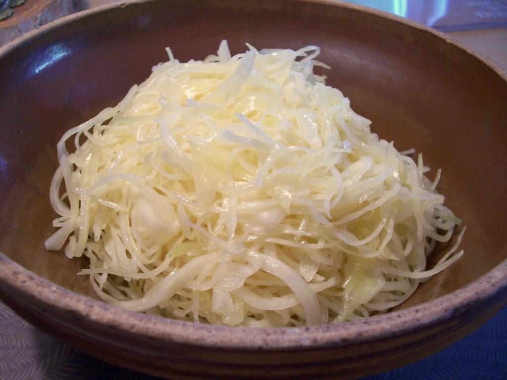 1 TL Salz auf den Kohl streuen, die heiße Flüssigkeit darauf gießen und den Kohl sofort gut kneten oder dicht verschlossen schütteln. Der Salat bleibt dann 2 bis 3 Stunden stehen, während dieser Zeit