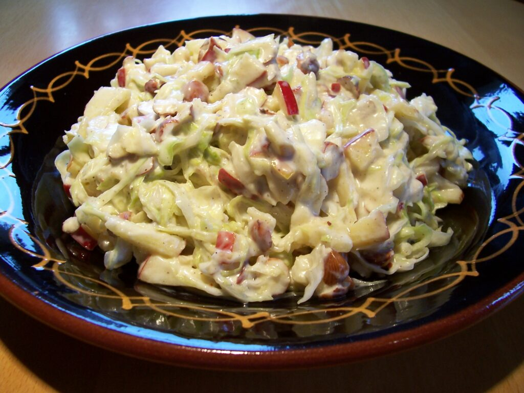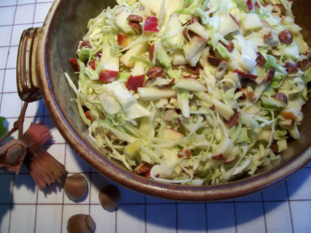50-75 g grob gehackte Haselnüsse / Walnüsse unter den Salat heben.