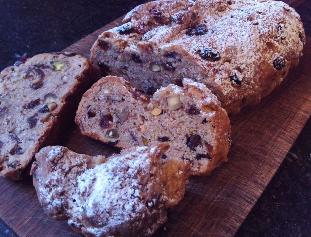 1 EL Butter / Veggie-Butter (ca. 25 g) schmelzen und auf den noch warmen Stollen streichen. Den Stollen komplett abkühlen lassen und dann mit