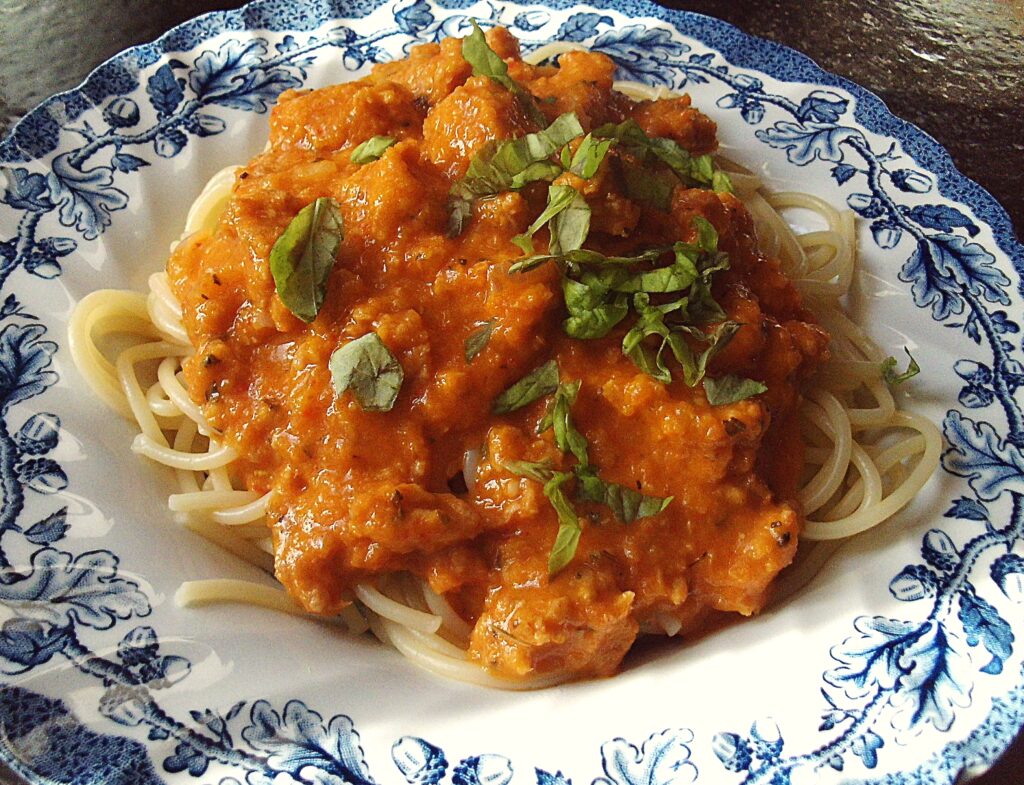 Die Tomaten durch 400 g 📜Paprikapüree ersetzen. Ahornsirup und Pfeffer weglassen. Spaghetti dazu kochen und der Paprikasoße kurz vor Ende der Nudelkochzeit 200 ml Nudelkochwasser zugeben.