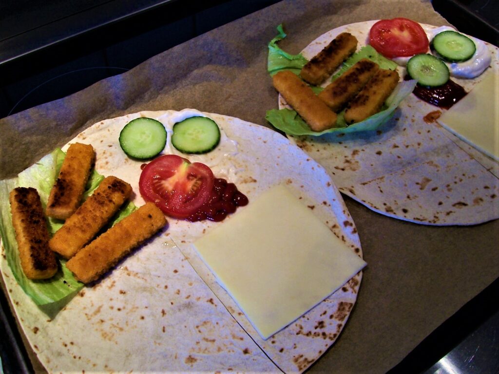 Nimm für jede Person 1 Fladen, lege sie überlappend auf ein Backblech und erwärme sie für 5 Minuten bei 50 Grad C Ober- und Unterhitze (vorgeheizt).