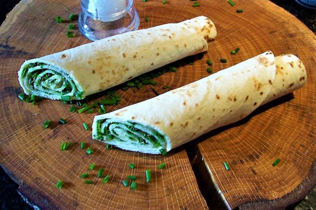 Die Teigfladen (nicht vorwärmen) würzig bestreichen, z. B. mit Ajvar / Hummus / Rosmarincreme / Tomatenbutter / Zwiebeldip und zusätzlich jeweils frischen Kräutern. Hier auf dem Foto seht ihr Yufkarollen mit weicher! Butter bestrichen, grobem Salz aus der Mühle und Schnittlauch bestreut (der Schnittlauchbrezel nachempfunden):