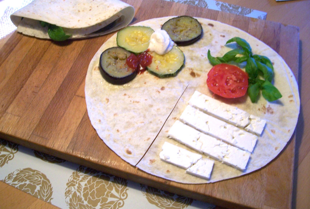 Tip: Die Dürümtasche verträgt kräftigen Geschmack – da kann es auch einmal Curryketchup oder ein herzhafter Dip sein. Auch ist es wichtig, die Zutaten über das jeweilige gesamte Viertel zu legen, damit die Tasche am Rand nicht hohl bleibt,