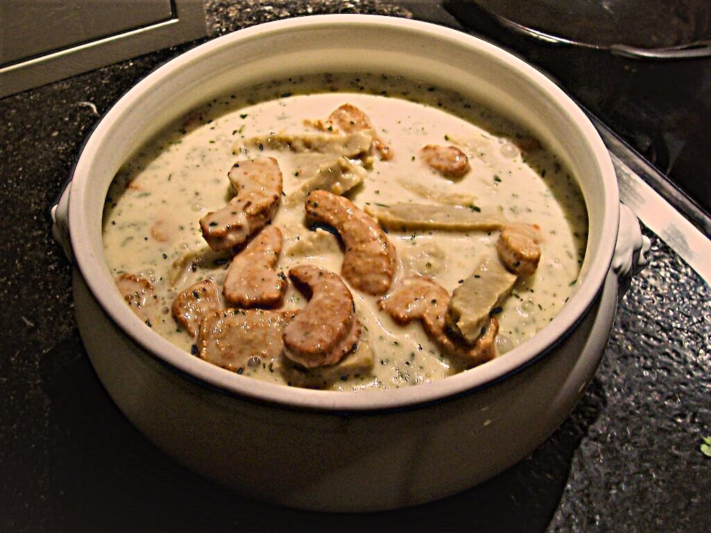 📉Falls du Veggie-Schnetzel kennst, die du verträgst und falls du Eier verträgst, hast du hier die Wahl. Das Kernmehl ggf. durch 15 g Stärke ersetzen (mit wenig Wasser glatt gerührt). Die geringe Menge Parmesan ggf. belassen. Hafer-Sahne für die vegane Variante.